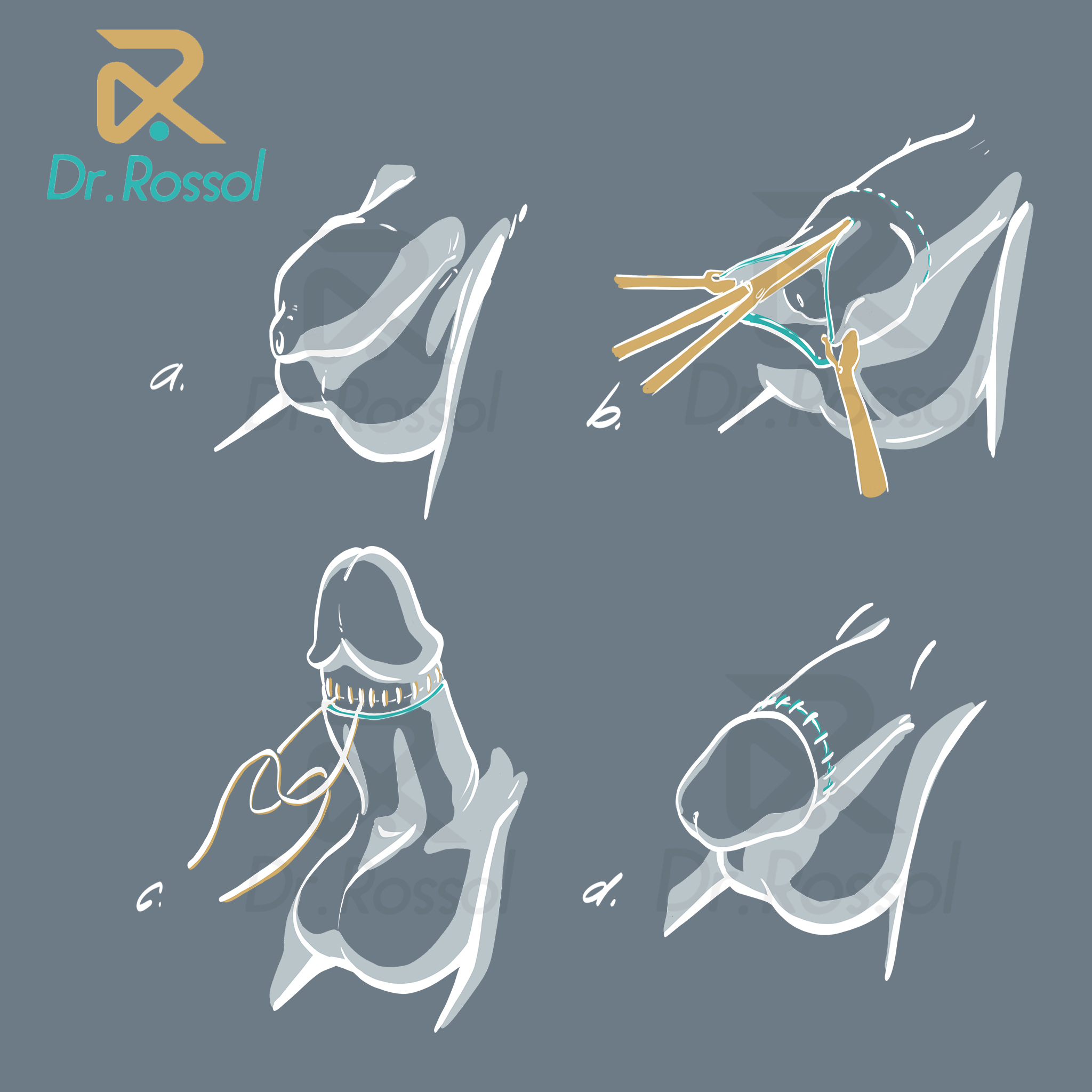 Na sequência de fotos abaixo é demostrado um caso de postectomia realizada pelo Dr. Rossol. O paciente apresentava quadro de balanites de repetição, e o tratamento clínico não apresentava mais melhora da inflamação crônica.Abaixo a ilustração de uma postectomia em paciente com BALANITES DE REPETIÇÃO: