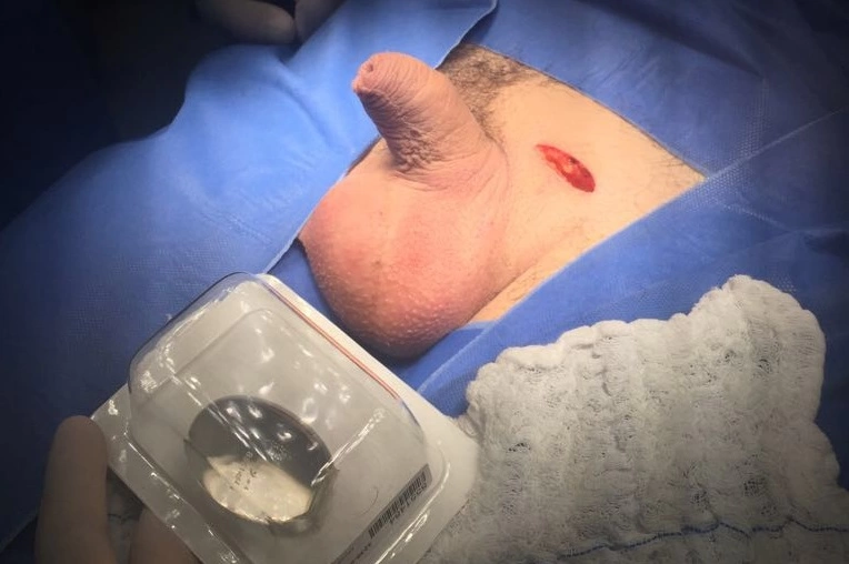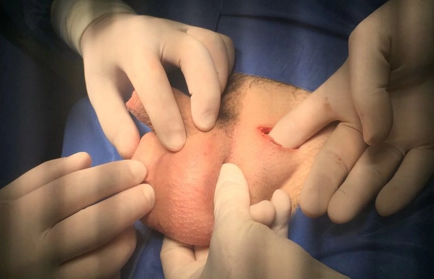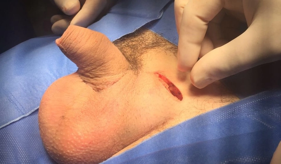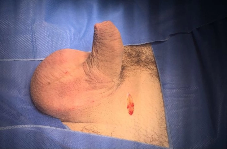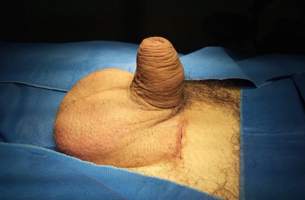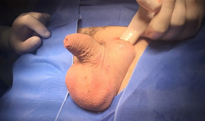 Normalmente, nesta situação, o saco escrotal está presente, mas retraído e atrofiado. Na cirurgia pode-se criar um espaço subcutâneo (ou na fáscia de Dartos) para o implante das próteses. E, com o tempo, o peso delas ajuda a expandir a pele formando a bolsa escrotal.