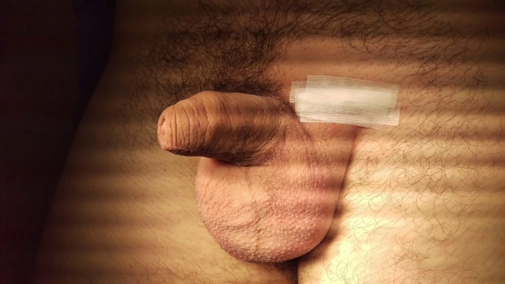 … encaixe e ajuste manual da prótese na bolsa escrotal …