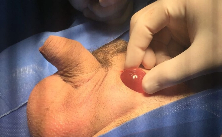 Nas imagens abaixo, ilustramos um implante de prótese testicular no hemiescroto esquerdo de um paciente com 23 anos, que apresentava criptorquidia na infância. Aquele testículo criptorquídico era atrófico e havia sido extirpado por um cirurgião pediátrico quando tinha 4 anos de idade.