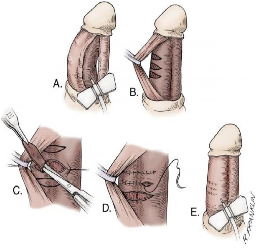 - Alongam a face ventral do pênis, realizando incisões transversais na túnica ventral e aplicando enxerto de tecido autólogo.