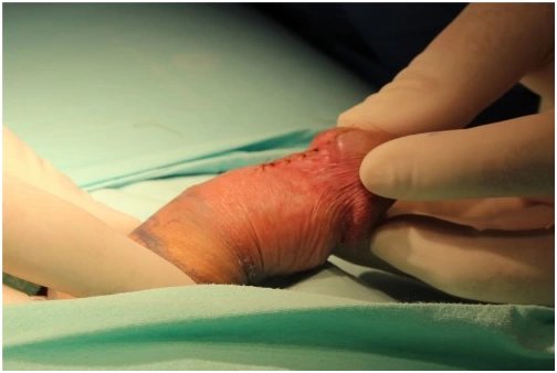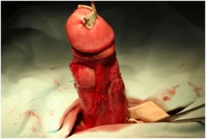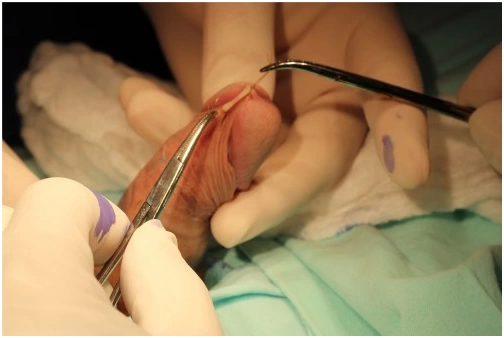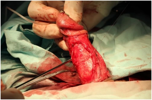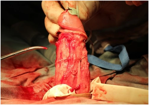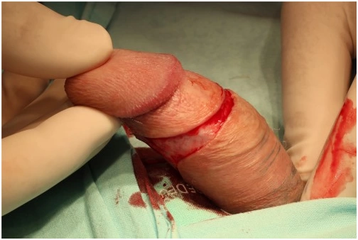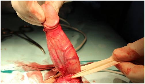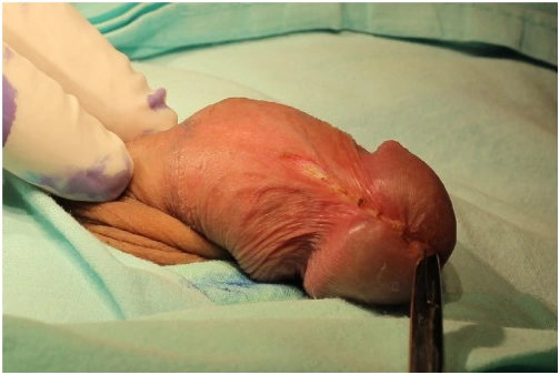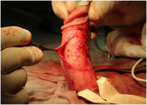 A abordagem cirúrgica mais comum para tratar a curvatura ventral congênita inclui, frequentemente, a realização prévia de circuncisão. Dessa forma, a postectomia melhora a drenagem linfática e venosa da pele peniana, facilitando o processo de cicatrização no pós-operatório.